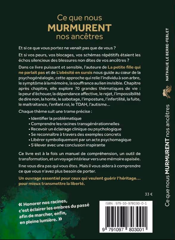 Qu’il y a en nous la mémoire des absents, les silences des générations, les blessures non verbalisées de ceux qui nous ont précédés. Ce jour-là, un chemin s’ouvre : celui de la psychogénéalogie. Ce livre est né de cette brèche. De ce besoin de comprendre autrement. De ressentir plus profondément. De faire des liens entre le visible et l’invisible, entre les symptômes et les secrets, entre l’individu et son système.